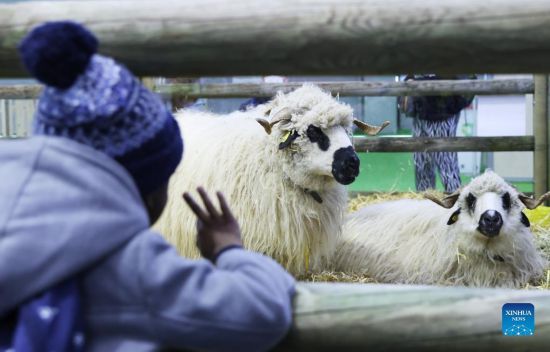 A child looks at sheep during the 58th International Agriculture Fair at the Porte de Versailles exhibition center in Paris, France, Feb. 26, 2022. The fair will last until March 6, 2022. (Xinhua/Gao Jing)