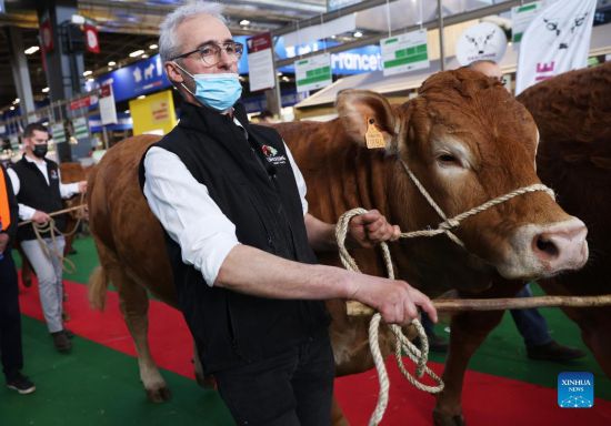 A staff member leads a cow during the 58th International Agriculture Fair at the Porte de Versailles exhibition center in Paris, France, Feb. 26, 2022. The fair will last until March 6, 2022. (Xinhua/Gao Jing)