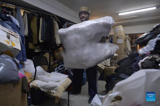 A volunteer arranges supplies donated by local residents for refugees from Donbass, in Rostov-on-Don, Russia, Feb. 26, 2022. (Photo by Andrey Bok/Xinhua)