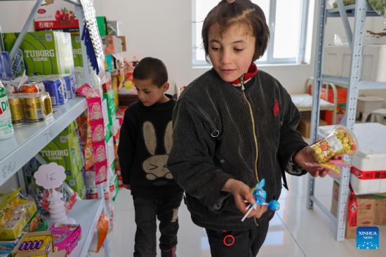 Children buy snacks in a shop in Rasekam Village of Taxkorgan Tajik Autonomous County, northwest China's Xinjiang Uygur Autonomous Region, Feb. 24, 2022.
