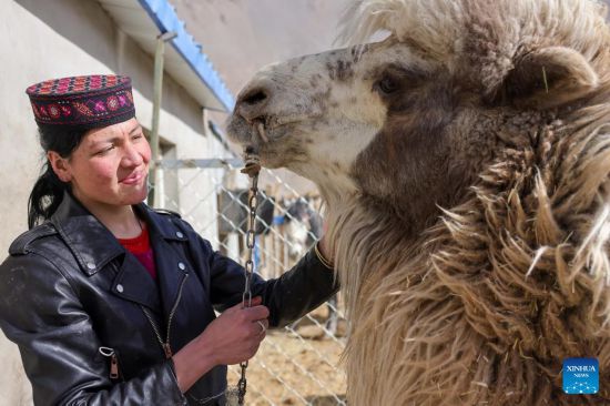 A villager takes care of a camel at home in Rasekam Village of Taxkorgan Tajik Autonomous County, northwest China's Xinjiang Uygur Autonomous Region, Feb. 24, 2022.
