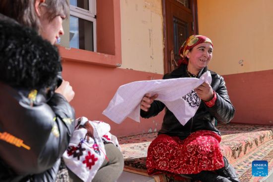 A villager displays traditional Tajik embroidery skills at home in Rasekam Village of Taxkorgan Tajik Autonomous County, northwest China's Xinjiang Uygur Autonomous Region, Feb. 24, 2022.