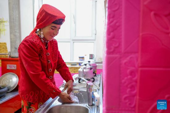 A villager washes a bowl with tap water in Rasekam Village of Taxkorgan Tajik Autonomous County, northwest China's Xinjiang Uygur Autonomous Region, Feb. 24, 2022.