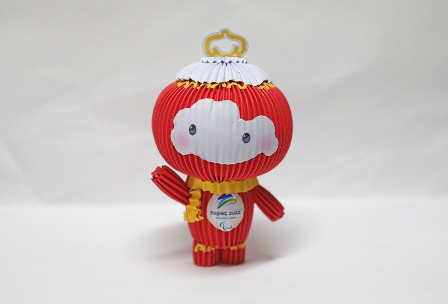 Photo taken on Feb. 10, 2022 shows a mascot of Beijing 2022 Paralympic Winter Games Shuey Rhon Rhon made of paper in Shenyang, capital of northeast China's Liaoning Province. (Xinhua/Yang Qing)