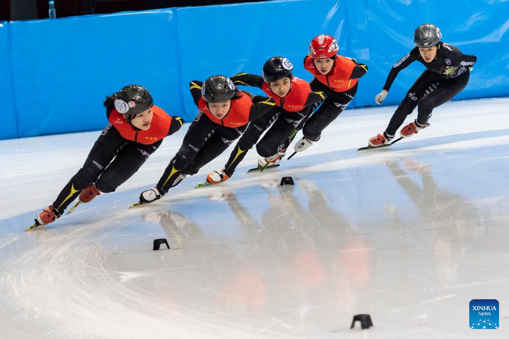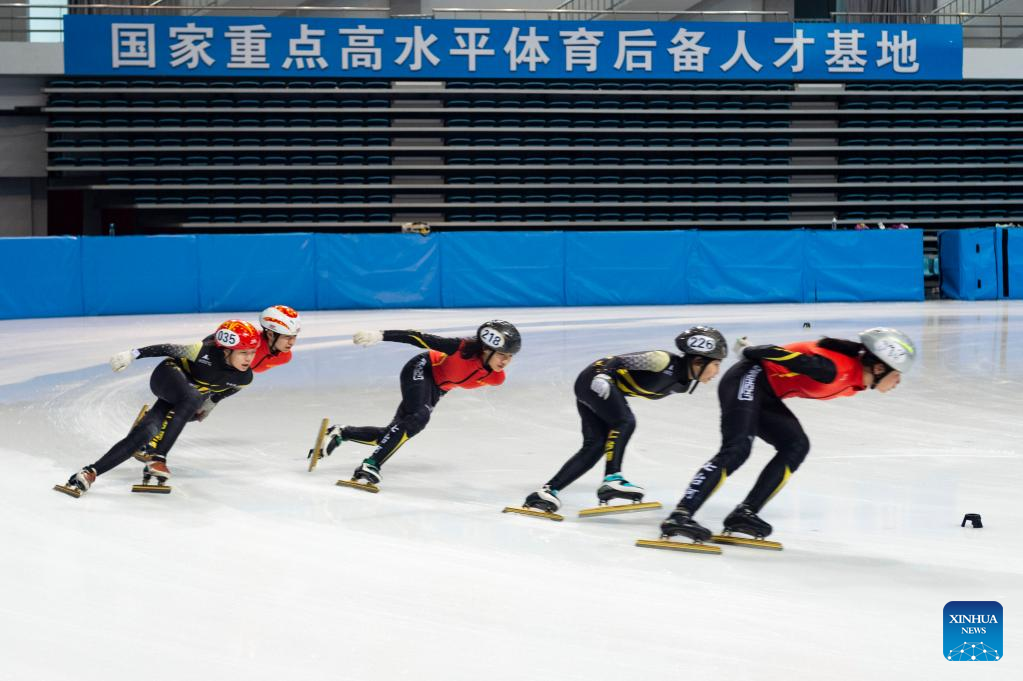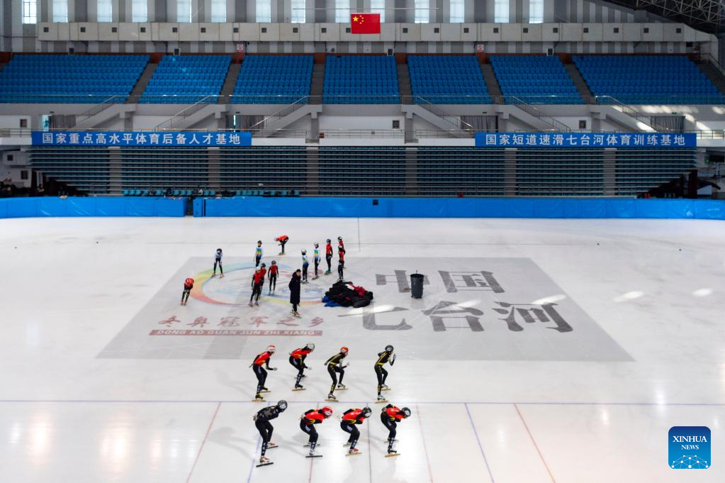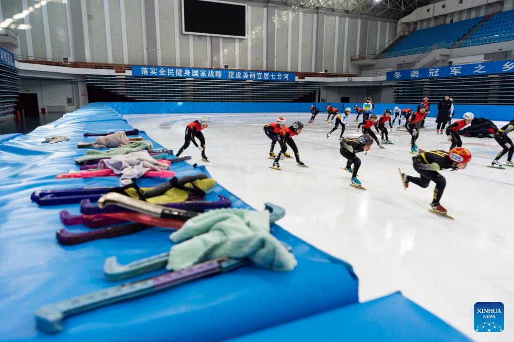 Photo taken on Feb. 24, 2022 shows students of Qitaihe municipal youth amateur athletic school taking part in a short track speed skating training session at Qitaihe Sports Center in Qitaihe City, northeast China's Heilongjiang Province. To date, 7 of China's 22 Winter Olympic gold medals have been claimed by athletes trained in Qitaihe City. The city has been stepping up efforts to train winter sports talents in recent years by building schools that provide short track speed skating training, setting up training base for provincial sports team, as well as holding ice and snow sports events. (Xinhua/Xie Jianfei)