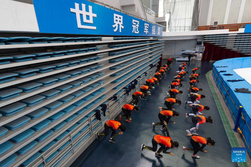 Photo taken on Feb. 24, 2022 shows students of a vocational college warming up ahead of a short track speed skating training session at Qitaihe Sports Center in Qitaihe City, northeast China's Heilongjiang Province. To date, 7 of China's 22 Winter Olympic gold medals have been claimed by athletes trained in Qitaihe City. The city has been stepping up efforts to train winter sports talents in recent years by building schools that provide short track speed skating training, setting up training base for provincial sports team, as well as holding ice and snow sports events. (Xinhua/Xie Jianfei)