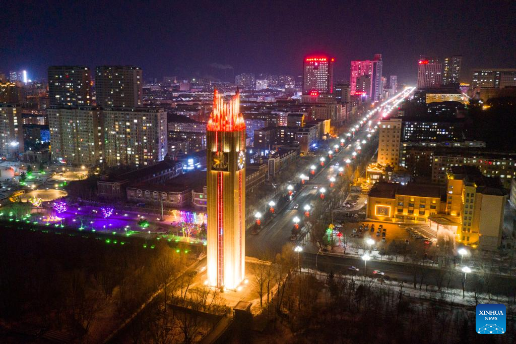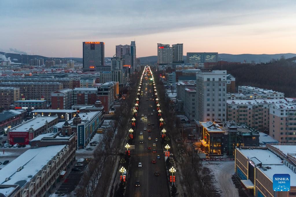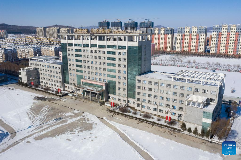 Aerial photo taken on Feb. 23, 2022 shows the street view of Qitaihe City, northeast China's Heilongjiang Province. To date, 7 of China's 22 Winter Olympic gold medals have been claimed by athletes trained in Qitaihe City. The city has been stepping up efforts to train winter sports talents in recent years by building schools that provide short track speed skating training, setting up training base for provincial sports team, as well as holding ice and snow sports events. (Xinhua/Xie Jianfei)