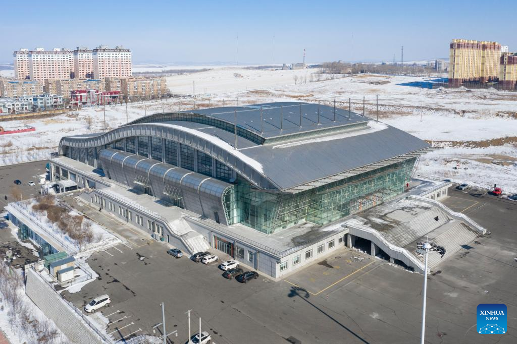 Aerial photo taken on Feb. 24, 2022 shows the exterior view of Qitaihe Sports Center in Qitaihe City, northeast China's Heilongjiang Province. To date, 7 of China's 22 Winter Olympic gold medals have been claimed by athletes trained in Qitaihe City. The city has been stepping up efforts to train winter sports talents in recent years by building schools that provide short track speed skating training, setting up training base for provincial sports team, as well as holding ice and snow sports events. (Xinhua/Xie Jianfei)