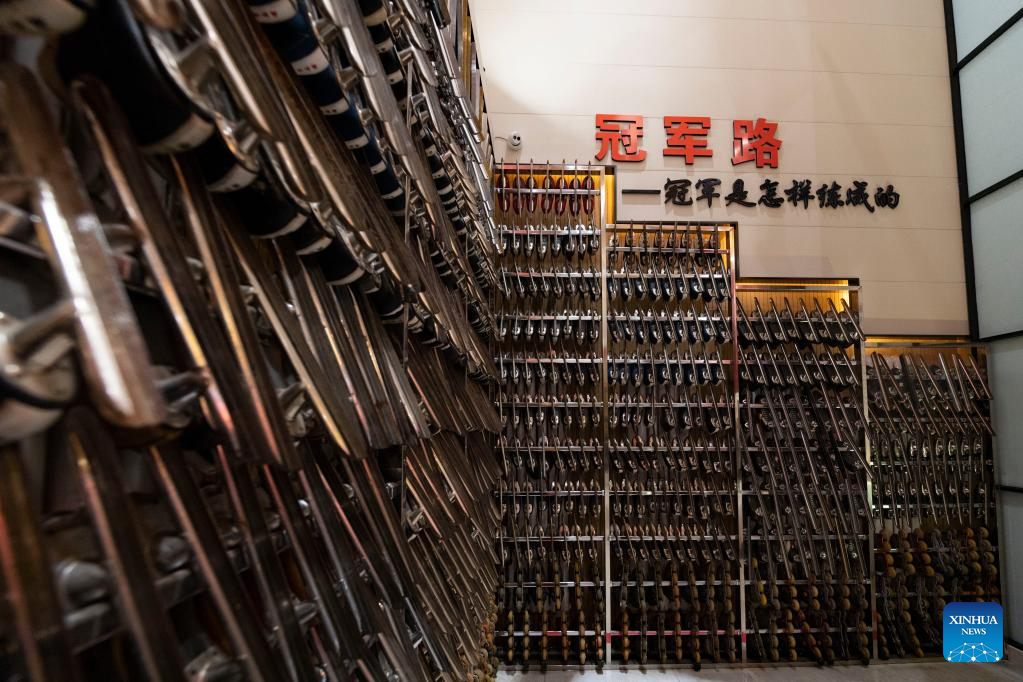 Photo taken on Feb. 23, 2022 shows a collection of hundreds pairs of ice skates displayed in the short track speed skating memorial hall in Qitaihe City, northeast China's Heilongjiang Province. To date, 7 of China's 22 Winter Olympic gold medals have been claimed by athletes trained in Qitaihe City. The city has been stepping up efforts to train winter sports talents in recent years by building schools that provide short track speed skating training, setting up training base for provincial sports team, as well as holding ice and snow sports events. (Xinhua/Xie Jianfei)