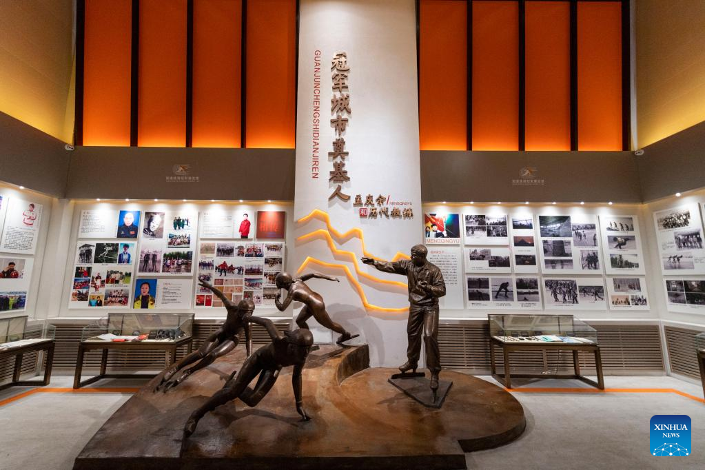 Photo taken on Feb. 23, 2022 shows the sculpture of Meng Qingyu, the late short track speed skating coach who ever cultivated a number of world champions, such as Yang Yang, Wang Meng and Fan Kexin, in the short track speed skating memorial hall in Qitaihe City, northeast China's Heilongjiang Province. To date, 7 of China's 22 Winter Olympic gold medals have been claimed by athletes trained in Qitaihe City. The city has been stepping up efforts to train winter sports talents in recent years by building schools that provide short track speed skating training, setting up training base for provincial sports team, as well as holding ice and snow sports events. (Xinhua/Xie Jianfei)