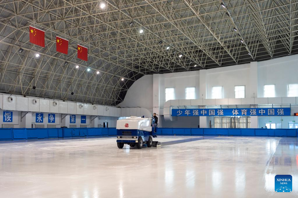 Photo taken on Feb. 24, 2022 shows the ice rink of Qitaihe Sports Center in Qitaihe City, northeast China's Heilongjiang Province. To date, 7 of China's 22 Winter Olympic gold medals have been claimed by athletes trained in Qitaihe City. The city has been stepping up efforts to train winter sports talents in recent years by building schools that provide short track speed skating training, setting up training base for provincial sports team, as well as holding ice and snow sports events. (Xinhua/Xie Jianfei)