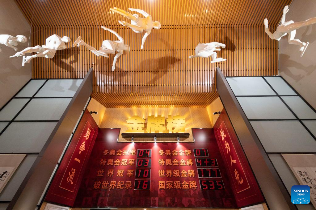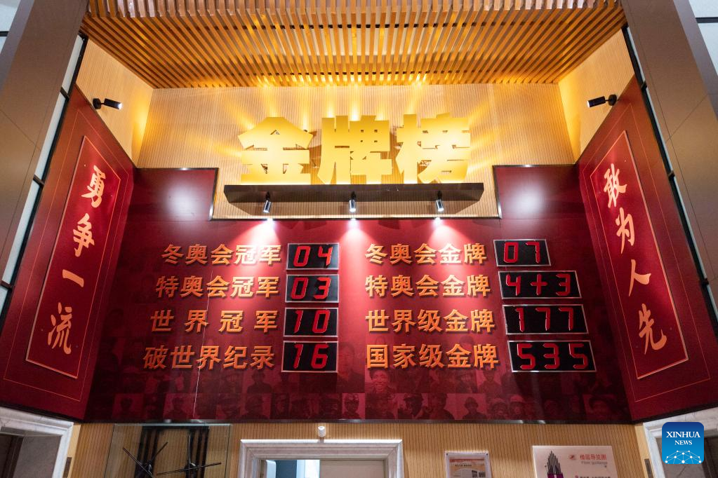 Photo taken on Feb. 23, 2022 shows the Gold Medal Wall, which reveals the sports achievements of the city in the short track speed skating memorial hall in Qitaihe City, northeast China's Heilongjiang Province. To date, 7 of China's 22 Winter Olympic gold medals have been claimed by athletes trained in Qitaihe City. The city has been stepping up efforts to train winter sports talents in recent years by building schools that provide short track speed skating training, setting up training base for provincial sports team, as well as holding ice and snow sports events. (Xinhua/Xie Jianfei)