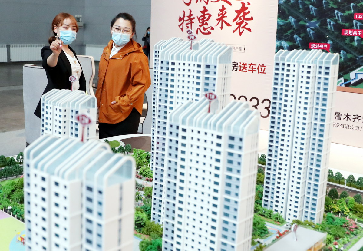 A saleswoman (left) shows a model of a newly developed residential area to a potential homebuyer in Urumqi, the capital city of Xinjiang Uygur autonomous region, on April 24. [Photo by Zhang Xiuke/For China Daily]