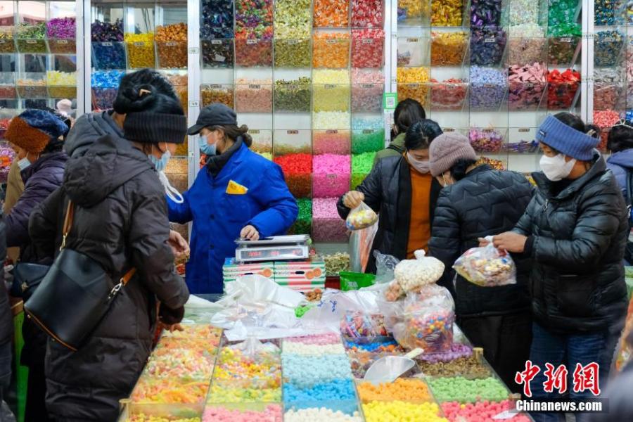 Locals shop at a bazaar in Lhasa, southwest China's Tibet Autonomous Region, Feb 27, 2022. As Losar, or Tibetan New Year, draws near, people in Lhasa get busy with their annual shopping. (Photo: China News Service/Jiang Feibo)