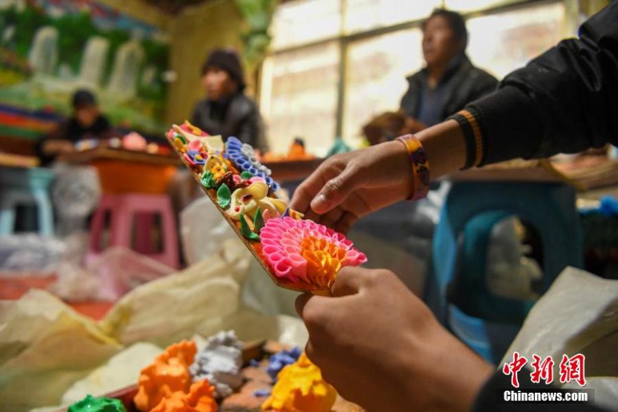 Butter sculptures are seen to celebrate the upcoming traditional new year, Feb 27, 2022. As Losar, or Tibetan New Year, draws near, people in Lhasa get busy with their annual shopping. (Photo/ China News Service)