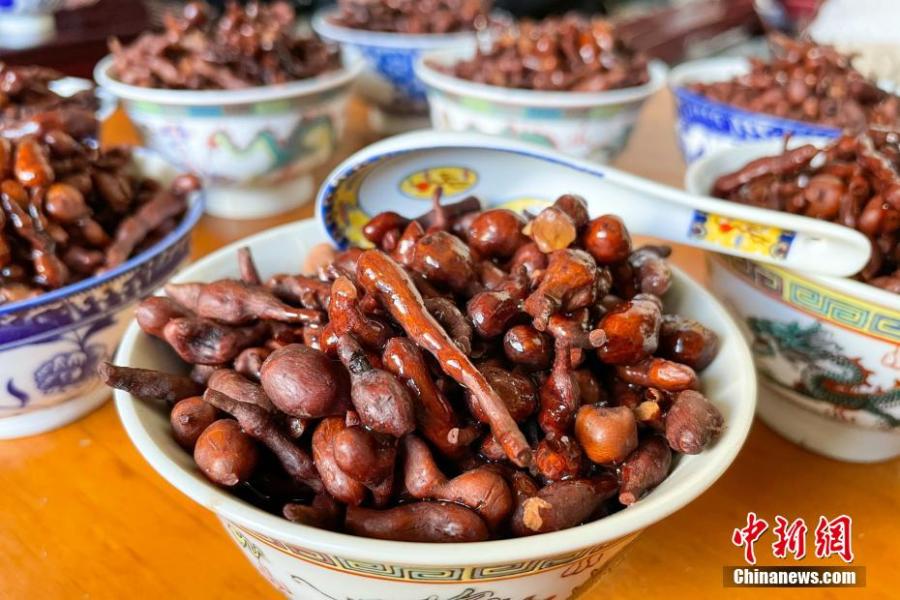 Traditional Tibetan food are seen at a bazaar in Lhasa, southwest China's Tibet Autonomous Region, Feb 27, 2022. As Losar, or Tibetan New Year, draws near, people in Lhasa get busy with their annual shopping. (Photo/ China News Service)