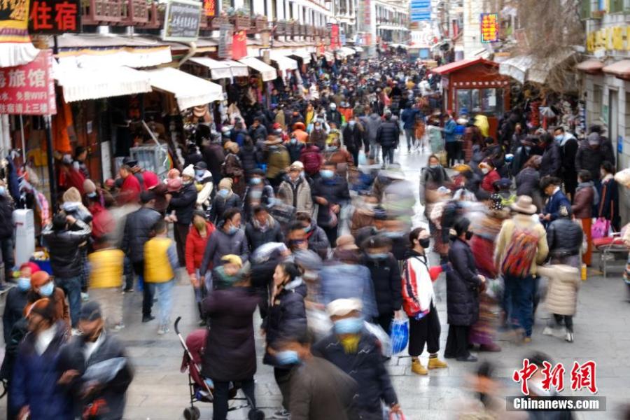 Locals shop at a bazaar in Lhasa, southwest China's Tibet Autonomous Region, Feb 27, 2022. As Losar, or Tibetan New Year, draws near, people in Lhasa get busy with their annual shopping. (Photo: China News Service/Jiang Feibo)