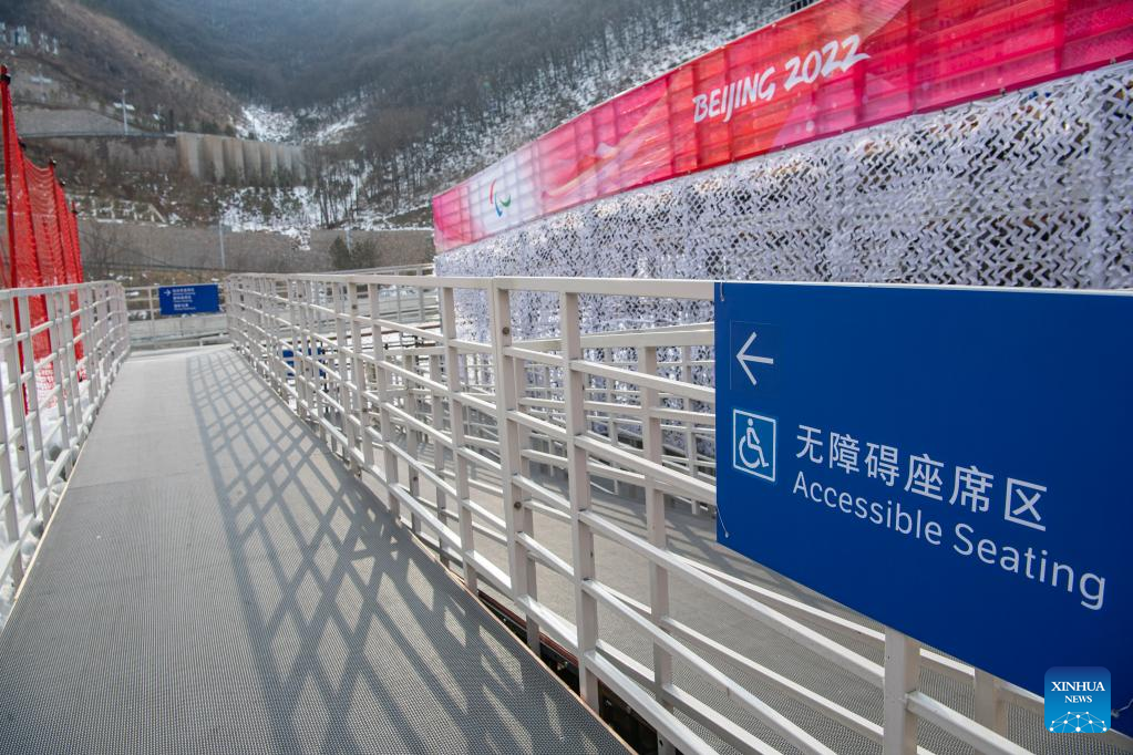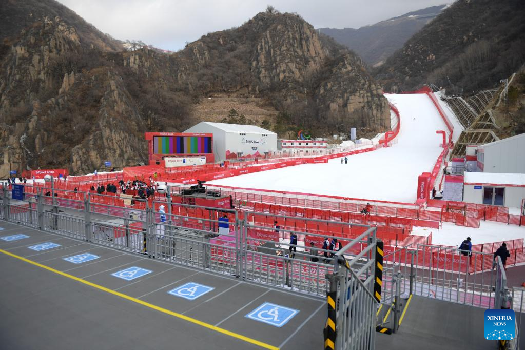 Photo taken on Feb. 28, 2022 shows a view of China's National Alpine Skiing Center in Yanqing District, Beijing, capital of China. After the Winter Olympics, China's National Alpine Skiing Center in Yanqing entered the transition stage to better serve the Beijing 2022 Winter Paralympic Games. As of today, the venue has set up a total of 23 permanent and temporary barrier-free lifts, 25 ramps and other accessible facilities. (Xinhua/Sun Fei)