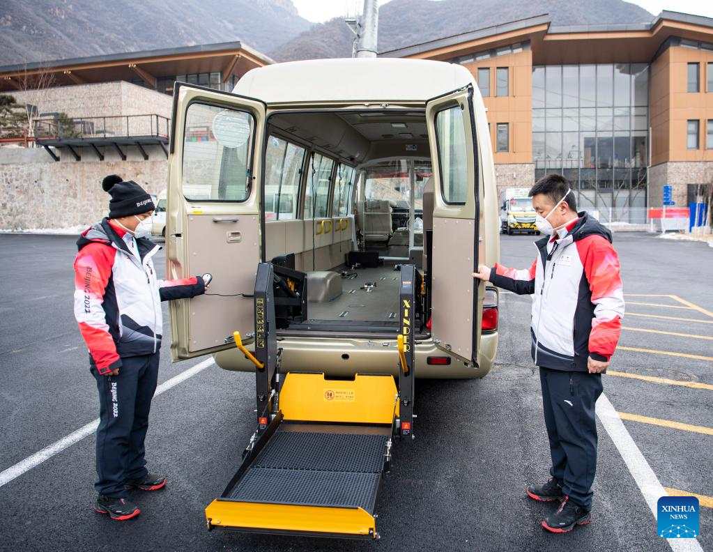 Staff members show a barrier-free car at China's National Alpine Skiing Center in Yanqing District, Beijing, capital of China, Feb. 28, 2022. After the Winter Olympics, China's National Alpine Skiing Center in Yanqing entered the transition stage to better serve the Beijing 2022 Winter Paralympic Games. As of today, the venue has set up a total of 23 permanent and temporary barrier-free lifts, 25 ramps and other accessible facilities. (Xinhua/Sun Fei)
