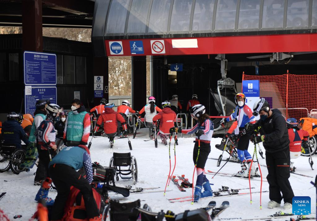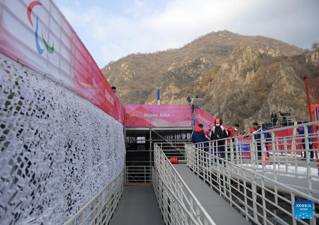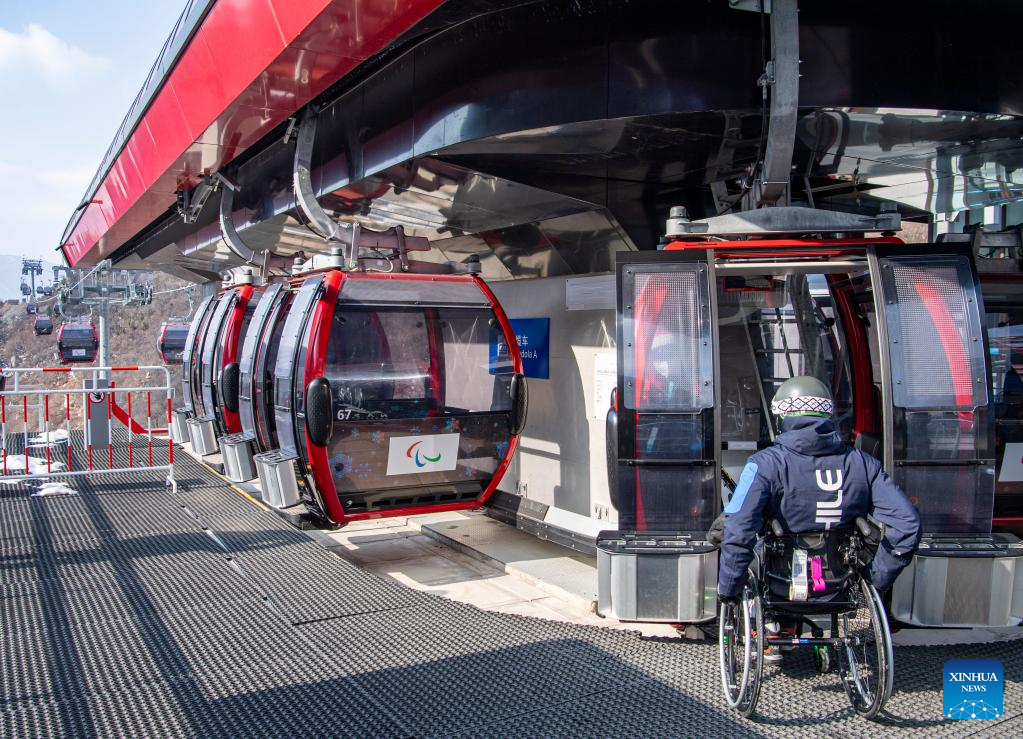 Athletes prepare to ride cable cars at China's National Alpine Skiing Center in Yanqing District, Beijing, capital of China, Feb. 28, 2022. After the Winter Olympics, China's National Alpine Skiing Center in Yanqing entered the transition stage to better serve the Beijing 2022 Winter Paralympic Games. As of today, the venue has set up a total of 23 permanent and temporary barrier-free lifts, 25 ramps and other accessible facilities. (Xinhua/Zhang Chenlin)