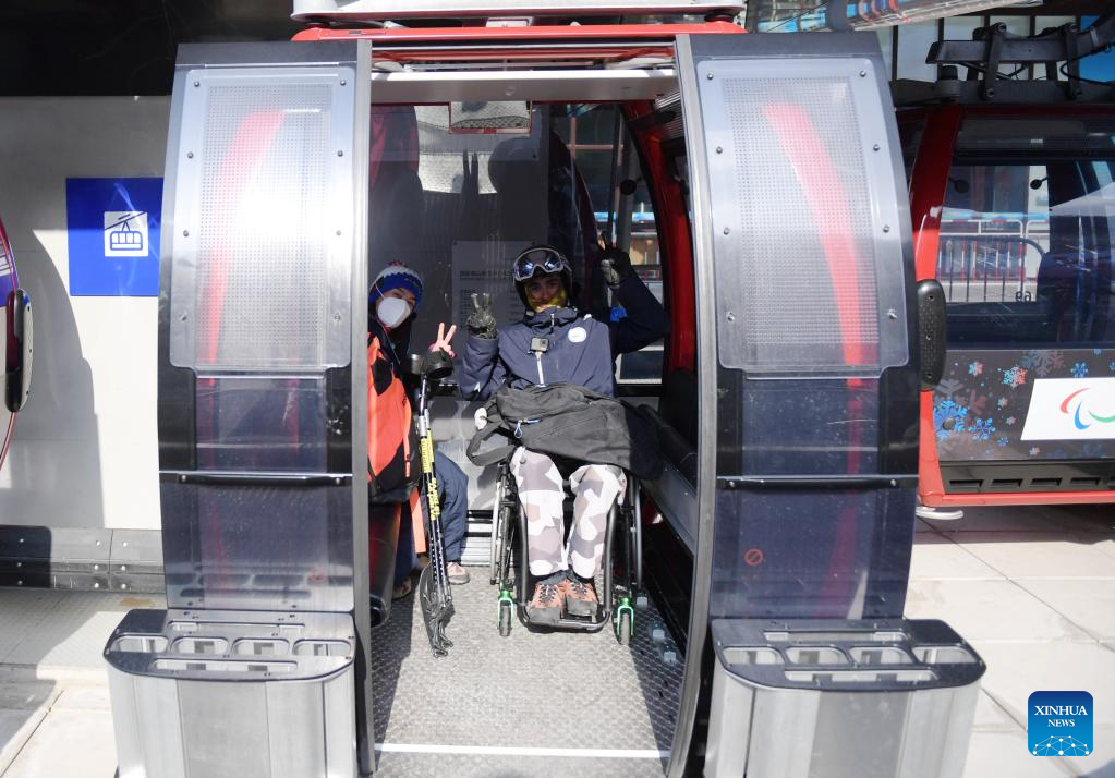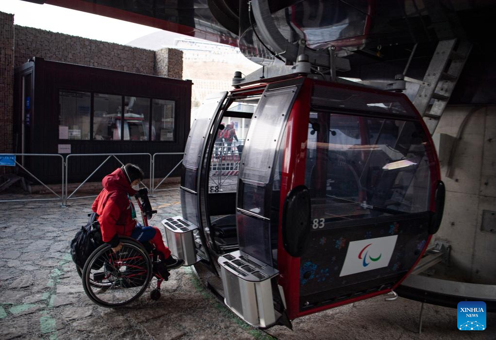 An athlete prepares to ride a cable car at China's National Alpine Skiing Center in Yanqing District, Beijing, capital of China, Feb. 28, 2022. After the Winter Olympics, China's National Alpine Skiing Center in Yanqing entered the transition stage to better serve the Beijing 2022 Winter Paralympic Games. As of today, the venue has set up a total of 23 permanent and temporary barrier-free lifts, 25 ramps and other accessible facilities. (Xinhua/Sun Fei)