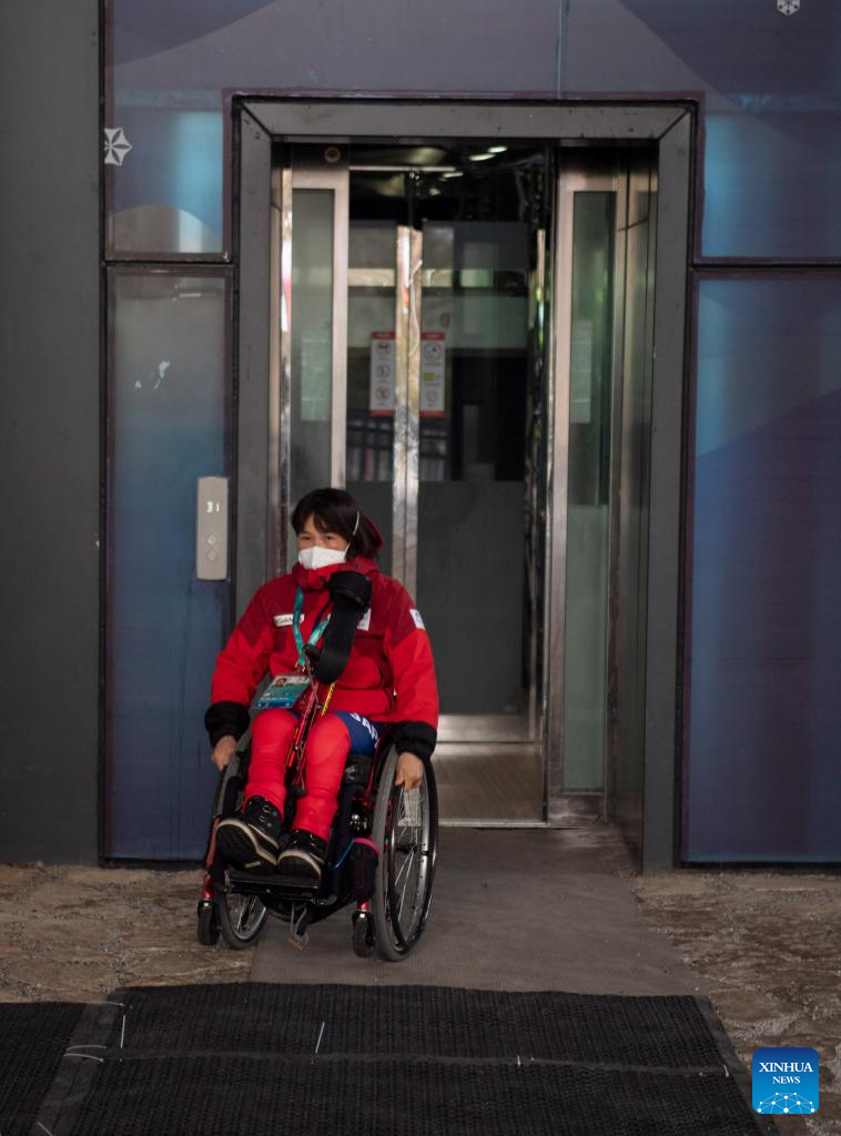 An athlete rides out of a barrier-free lift at China's National Alpine Skiing Center in Yanqing District, Beijing, capital of China, Feb. 28, 2022. After the Winter Olympics, China's National Alpine Skiing Center in Yanqing entered the transition stage to better serve the Beijing 2022 Winter Paralympic Games. As of today, the venue has set up a total of 23 permanent and temporary barrier-free lifts, 25 ramps and other accessible facilities. (Xinhua/Sun Fei)