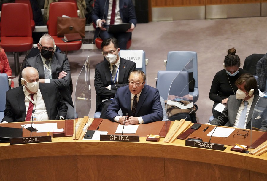 Zhang Jun (C, front), China's permanent representative to the United Nations, speaks during the Security Council emergency meeting on Ukraine at the UN headquarters in New York, Feb. 21, 2022. (Xinhua/Wang Ying)