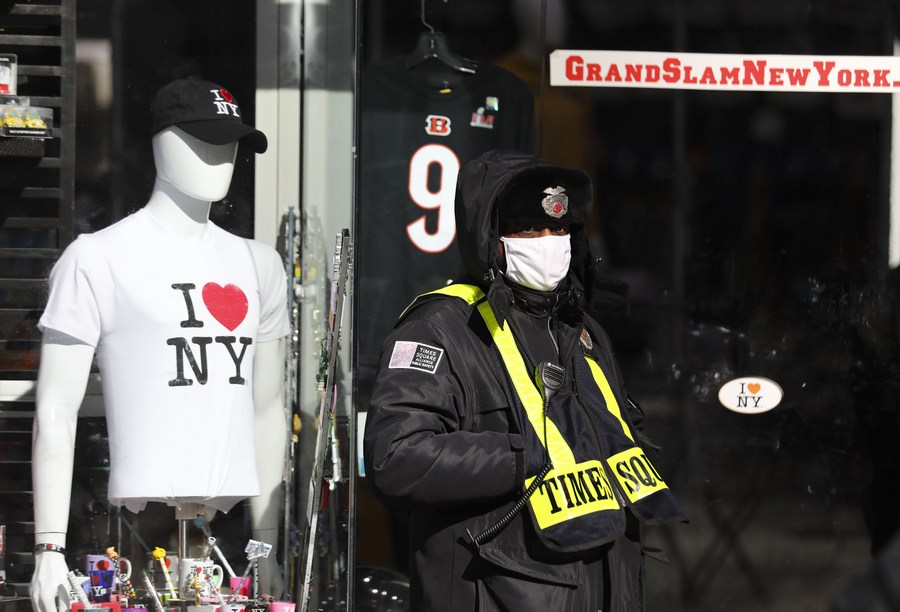 A security guard wearing face mask stands outside a store on Times Square in New York, the United States, Feb. 14, 2022. (Xinhua/Wang Ying)