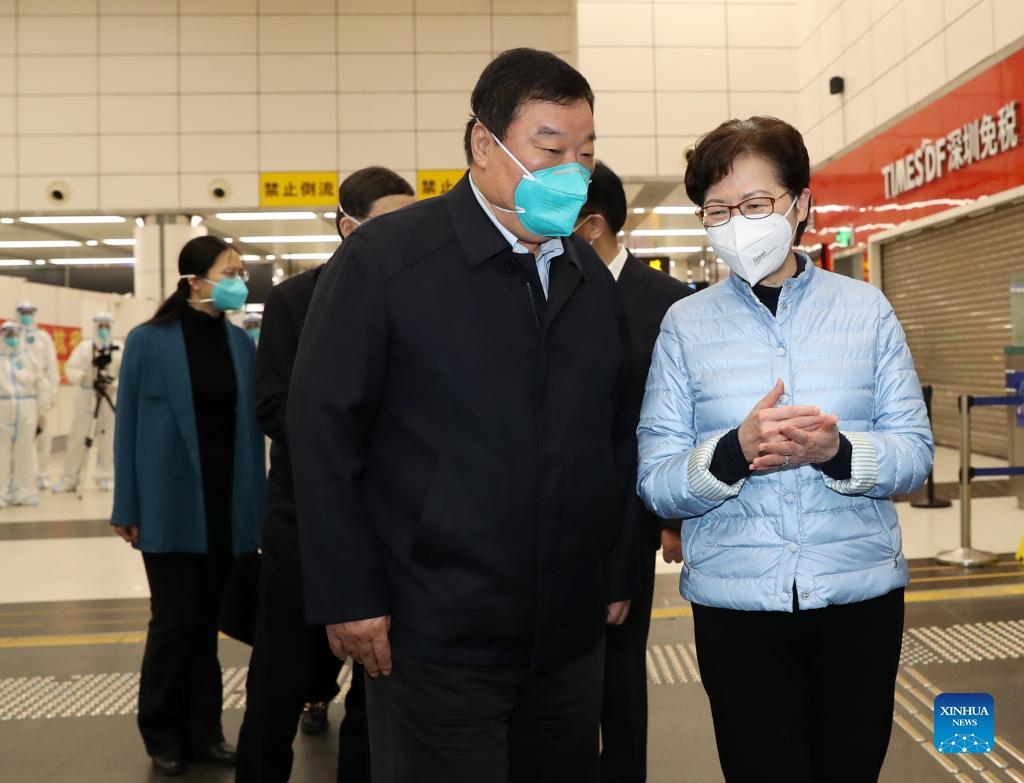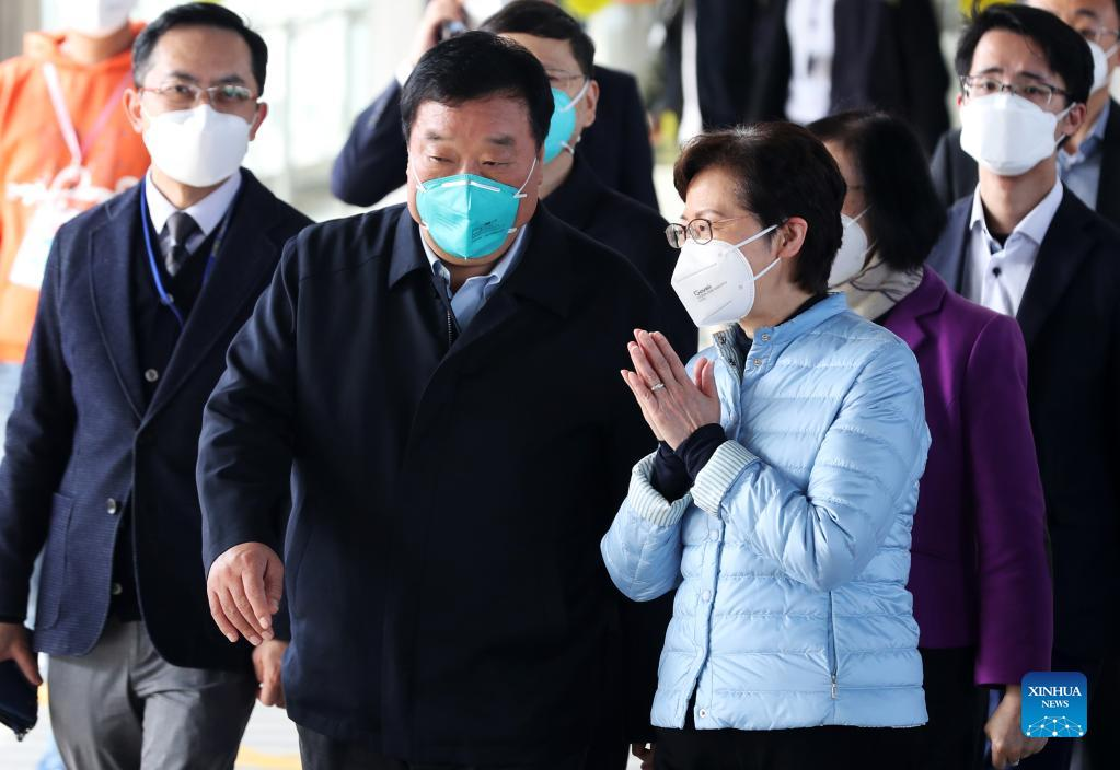 The third team of mainland health experts and personnel are welcomed by Carrie Lam, Chief Executive of the Hong Kong Special Administrative Region (HKSAR), upon arrival at south China's Shenzhen Bay Port on Feb. 28, 2022. (Xinhua/Li Gang)
