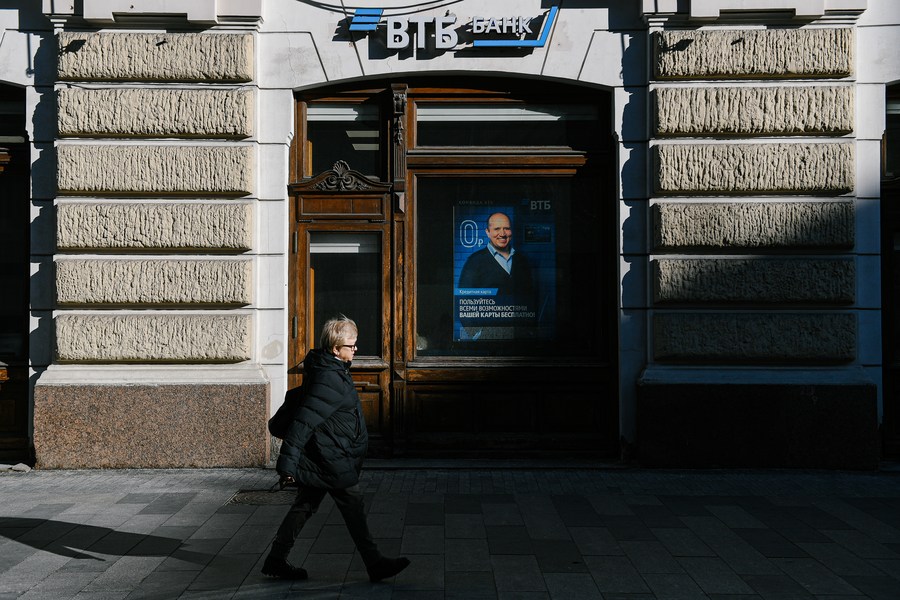 A woman passes by an office of VTB bank in Moscow, Russia, Feb. 25, 2022. (Xinhua/Evgeny Sinitsyn)