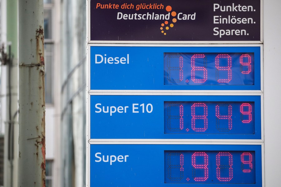 Photo taken on Feb. 25, 2022 shows diesel and gasoline prices displayed on a screen at a gas station in Frankfurt, Germany. (Photo by Armando Babani/Xinhua)