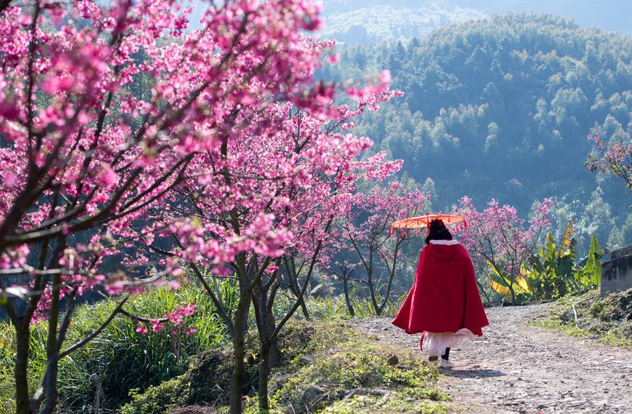 A tourist in a Han-style costume walks around the cherry garden in Beishan village, Songshan town, Luoyuan county, Fuzhou city in southeast China's Fujian Province. (Photo/Liu Qiyi)