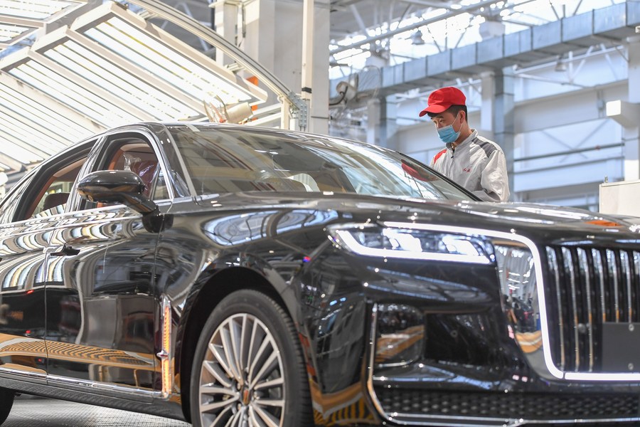 File photo taken on Sept. 23, 2020 shows that a worker checks a vehicle at the general assembly line of Hongqi, the leading sedan brand of First Automotive Works (FAW) Group Co. Ltd., in Changchun, northeast China's Jilin Province. (Xinhua/Zhang Nan)