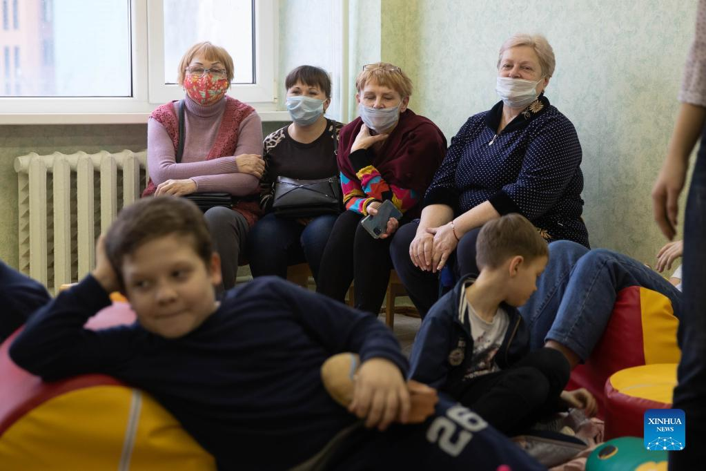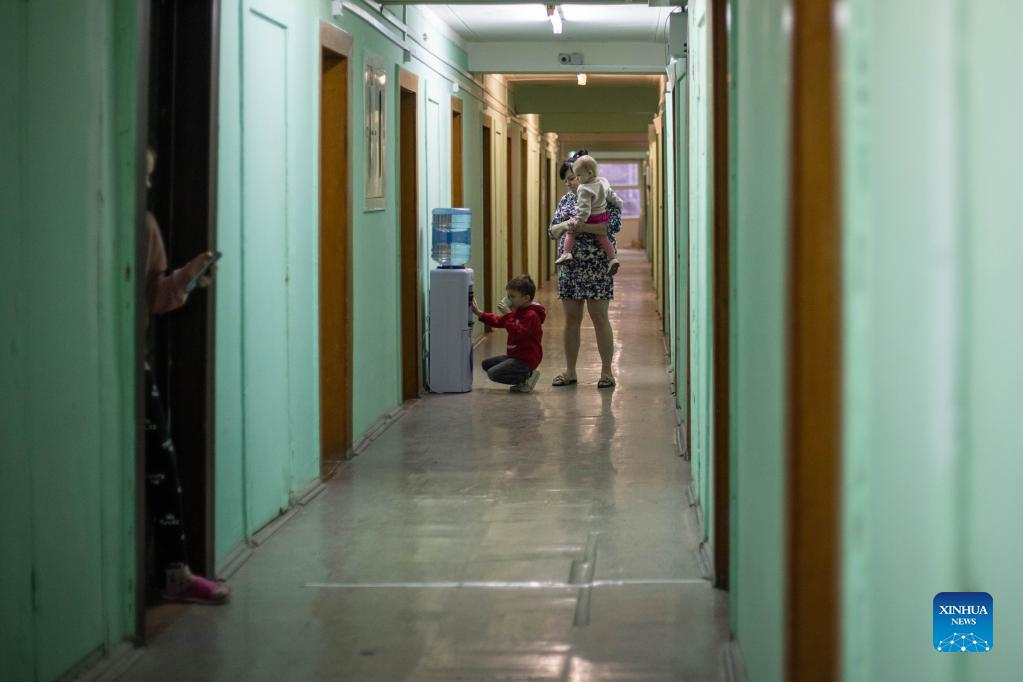 People from Donbass watch children playing at an accommodation site in a university dormitory in Rostov-on-Don, Russia, on Feb. 28, 2022. (Xinhua/Bai Xueqi)