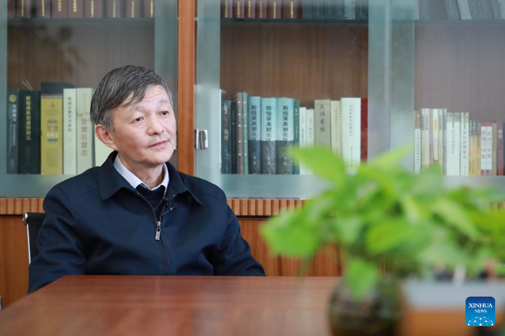 Photo taken on Feb. 22, 2022 shows Su Bomin at Dunhuang Academy in Dunhuang, northwest China's Gansu Province. Su Bomin, a deputy to the National People's Congress (NPC), also dean of Dunhuang Academy, has been working for three decades in the Mogao Grottoes, a UNESCO World Heritage site in Dunhuang, northwest China's Gansu Province.(Xinhua/Du Zheyu)
