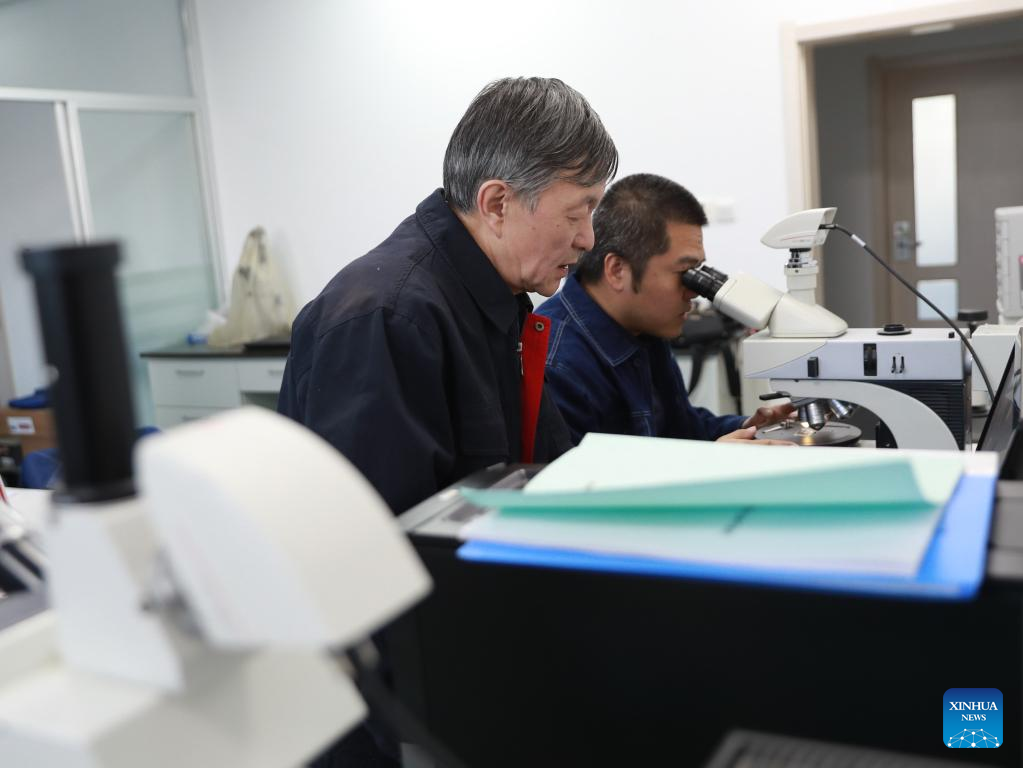Su Bomin (L) works at a research laboratory of Dunhuang Academy in Dunhuang, northwest China's Gansu Province, Feb. 23, 2022. Su Bomin, a deputy to the National People's Congress (NPC), also dean of Dunhuang Academy, has been working for three decades in the Mogao Grottoes, a UNESCO World Heritage site in Dunhuang, northwest China's Gansu Province. (Xinhua/Zhang Yujie)