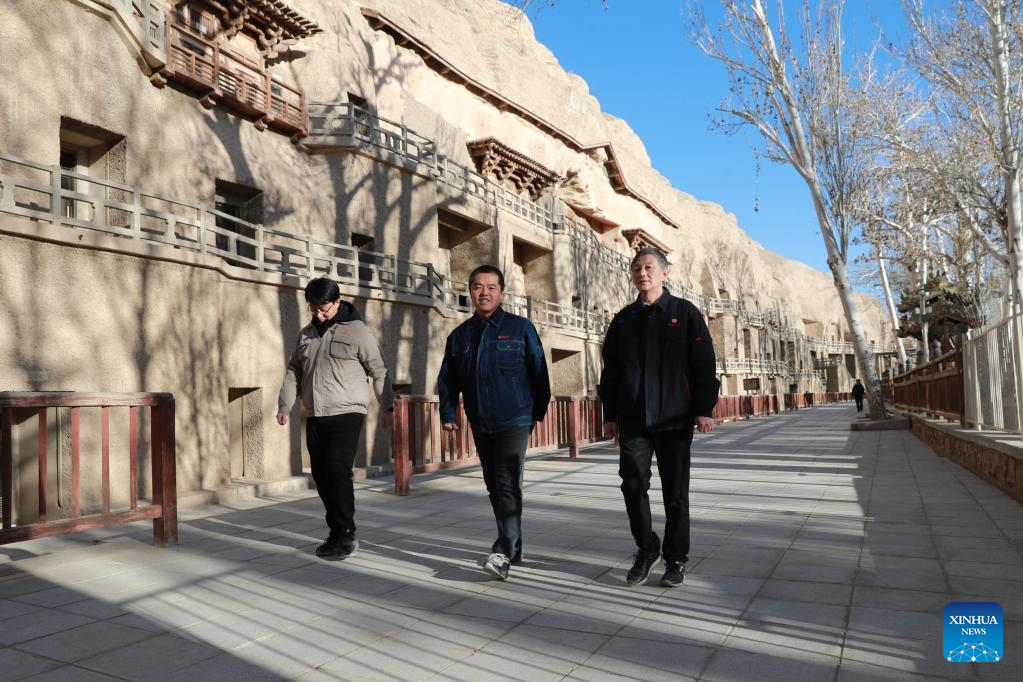 Su Bomin (R), together with technicians of Dunhuang Academy, visit the Mogao Grottoes in Dunhuang, northwest China's Gansu Province, Feb. 23, 2022. Su Bomin, a deputy to the National People's Congress (NPC), also dean of Dunhuang Academy, has been working for three decades in the Mogao Grottoes, a UNESCO World Heritage site in Dunhuang, northwest China's Gansu Province. (Xinhua/Du Zheyu)