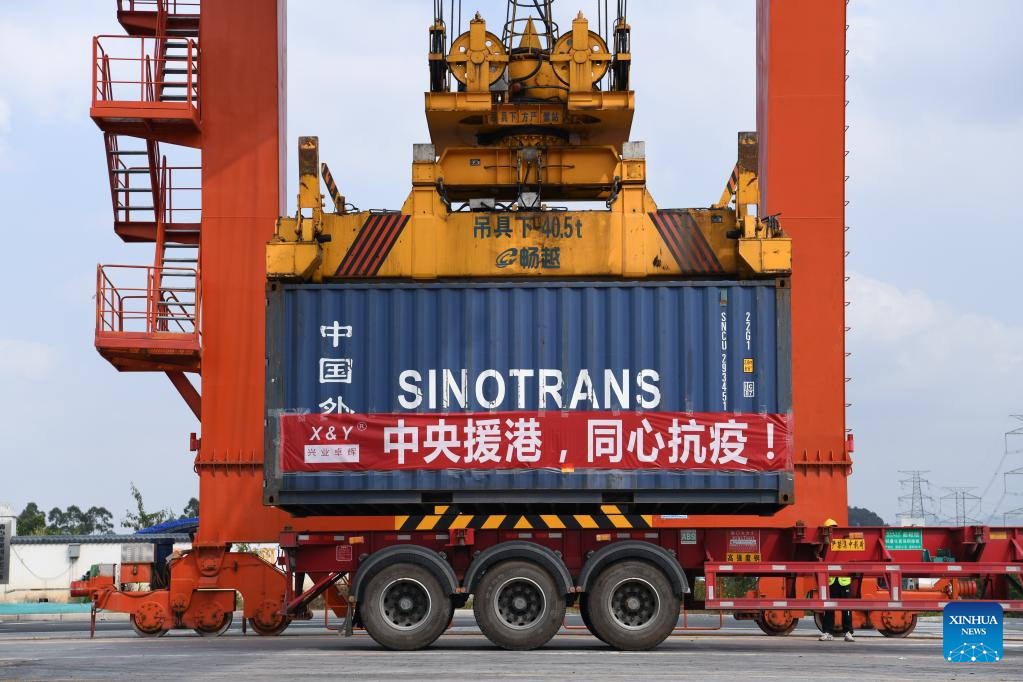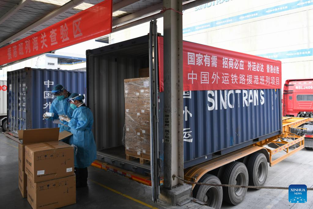 Customs staff check supplies for Hong Kong in Shenzhen, south China's Guangdong Province, March 1, 2022. A special freight train will start operation on Wednesday to stabilize mainland supply of goods to Hong Kong amid the COVID-19 epidemic. (Xinhua/Liang Xu)