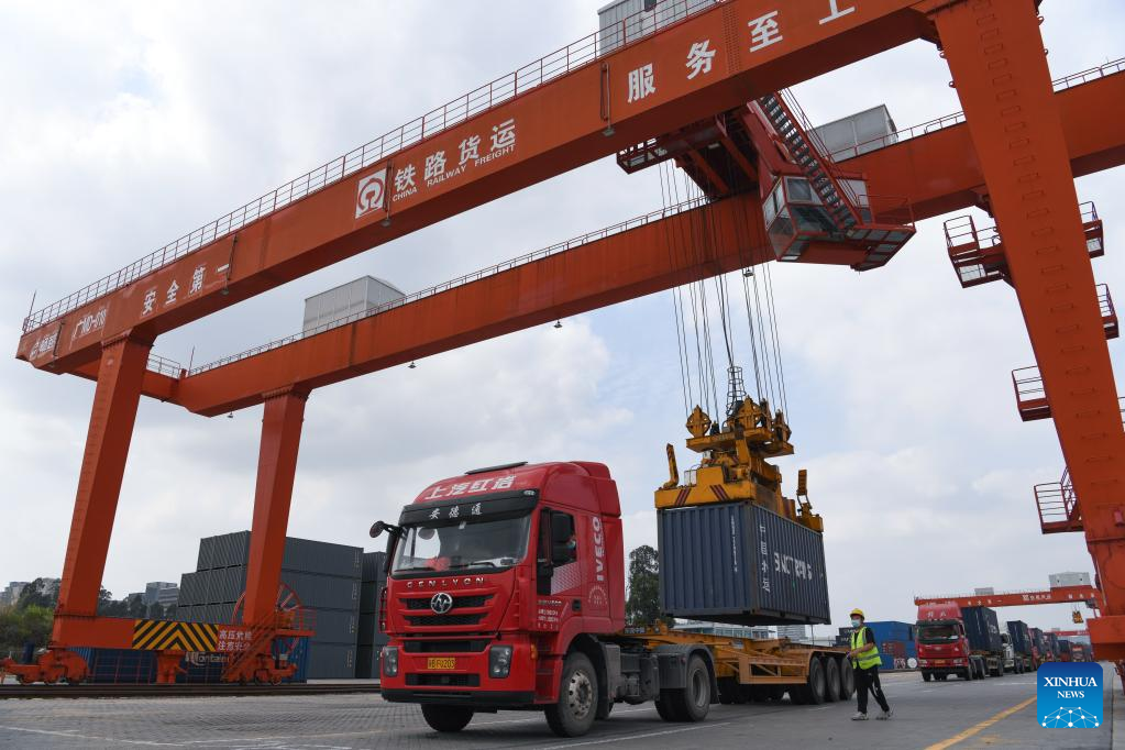 A crane loads containers carrying supplies for Hong Kong at Pinghu South Railway Station in Shenzhen, south China's Guangdong Province, March 1, 2022. A special freight train will start operation on Wednesday to stabilize mainland supply of goods to Hong Kong amid the COVID-19 epidemic. (Xinhua/Liang Xu)