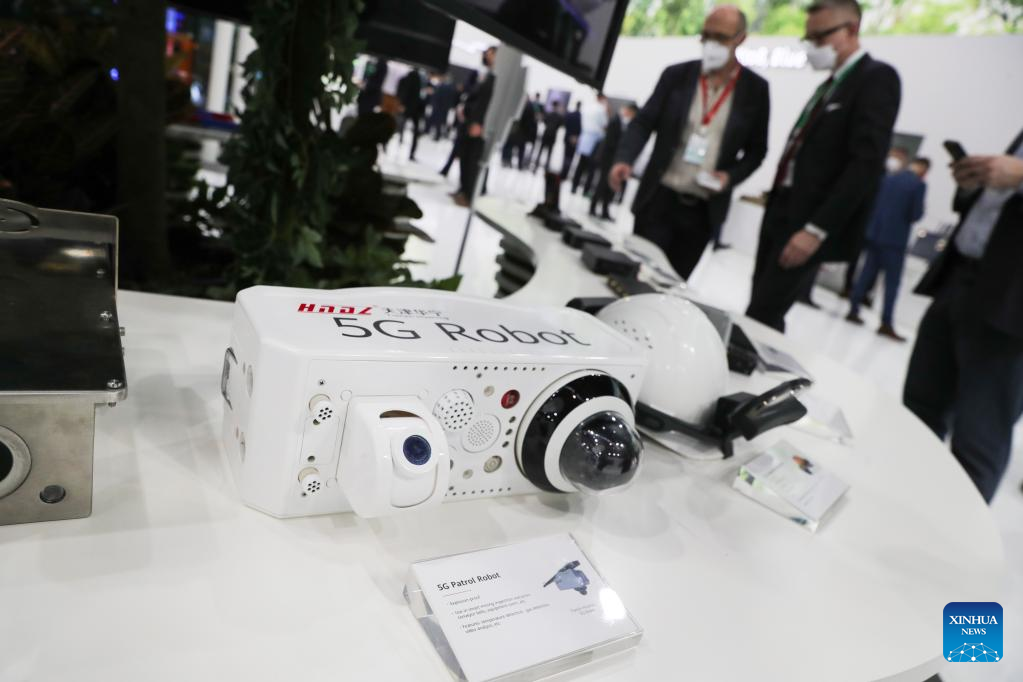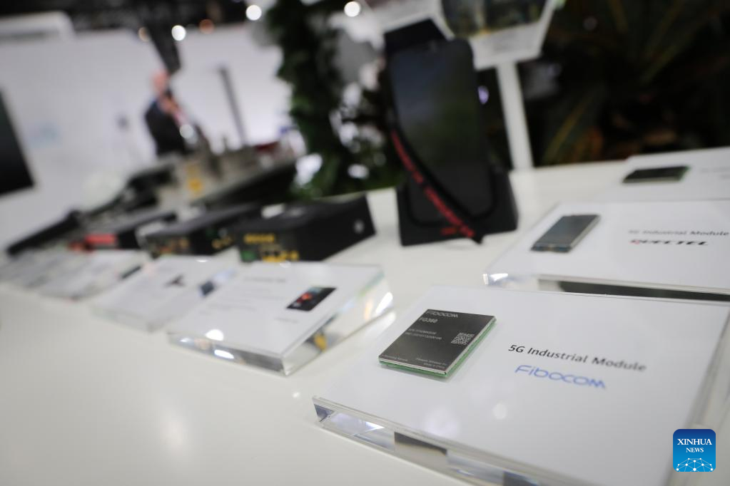 A 5G industrial module is displayed at the exhibition area of Huawei during the Mobile World Congress (MWC) in Barcelona, Spain, on March 1, 2022. Around 50 Chinese companies, including Huawei, ZTE and Xiaomi, are present at the annual Mobile World Congress (MWC), which opened its doors here on Monday. (Xinhua/Zheng Huansong)