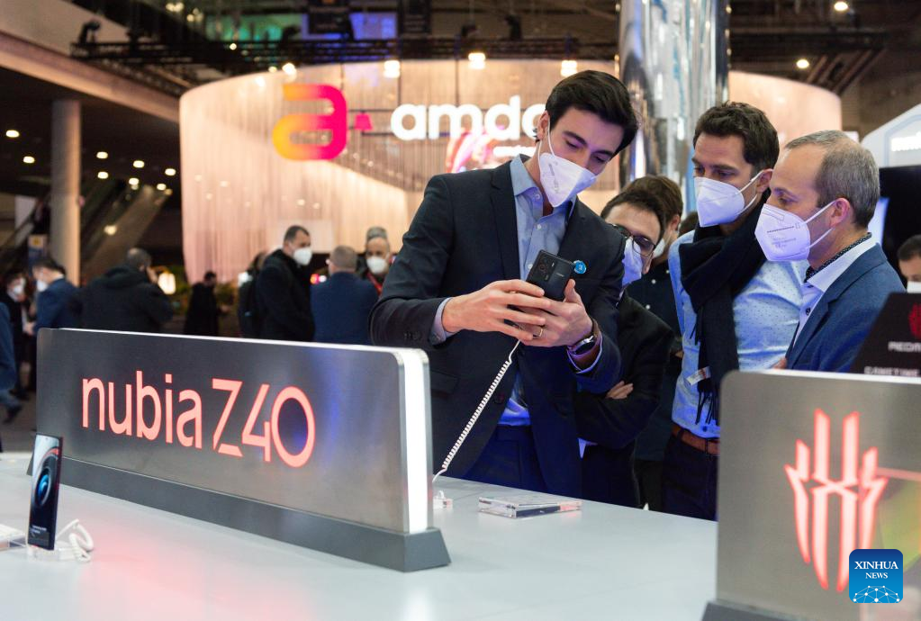 People look at a Nubia's cellphone during the Mobile World Congress (MWC) in Barcelona, Spain, on Feb. 28, 2022. Around 50 Chinese companies, including Huawei, ZTE and Xiaomi, are present at the annual Mobile World Congress (MWC), which opened its doors here on Monday. (Photo by Gustavo Valiente/Xinhua)