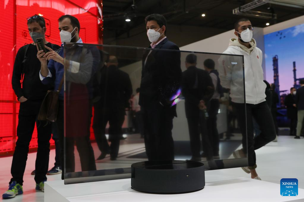 A Xiaomi's transparent TV is seen during the Mobile World Congress (MWC) in Barcelona, Spain, on March 1, 2022. Around 50 Chinese companies, including Huawei, ZTE and Xiaomi, are present at the annual Mobile World Congress (MWC), which opened its doors here on Monday. (Xinhua/Zheng Huansong)