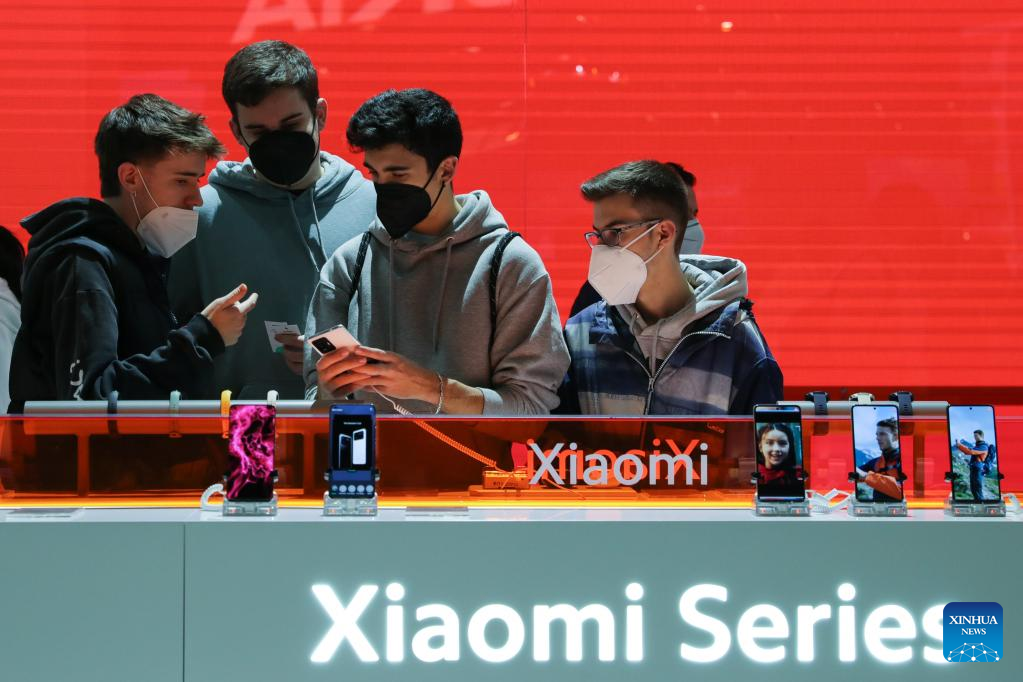 People look at a Xiaomi's cellphone during the Mobile World Congress (MWC) in Barcelona, Spain, on March 1, 2022. Around 50 Chinese companies, including Huawei, ZTE and Xiaomi, are present at the annual Mobile World Congress (MWC), which opened its doors here on Monday. (Xinhua/Zheng Huansong)