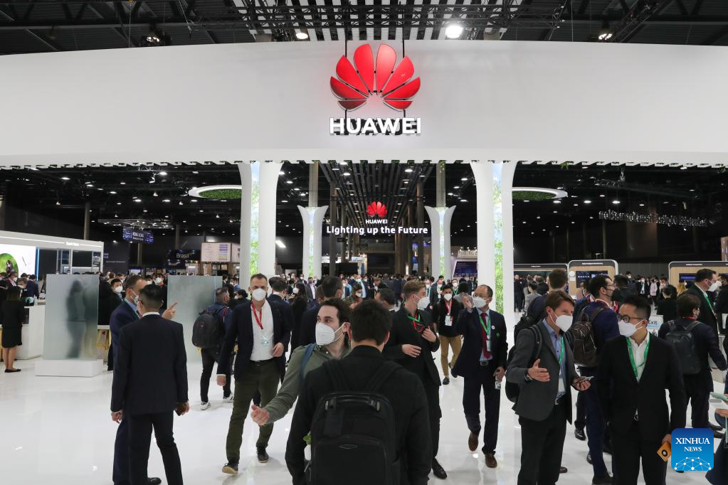 People visit the exhibition area of Huawei during the Mobile World Congress (MWC) in Barcelona, Spain, on March 1, 2022. Around 50 Chinese companies, including Huawei, ZTE and Xiaomi, are present at the annual Mobile World Congress (MWC), which opened its doors here on Monday. (Xinhua/Zheng Huansong)
