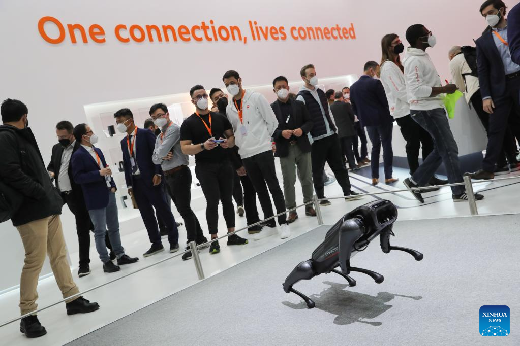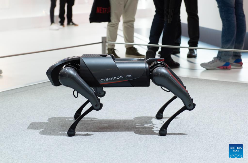 A Xiaomi CyberDog is seen during the Mobile World Congress (MWC) in Barcelona, Spain, on March 1, 2022. Around 50 Chinese companies, including Huawei, ZTE and Xiaomi, are present at the annual Mobile World Congress (MWC), which opened its doors here on Monday. (Xinhua/Zheng Huansong)