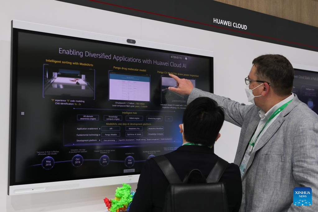 A staff member introduces the technologies related to Huawei Cloud at the exhibition area of Huawei during the Mobile World Congress (MWC) in Barcelona, Spain, on Feb. 28, 2022. Around 50 Chinese companies, including Huawei, ZTE and Xiaomi, are present at the annual Mobile World Congress (MWC), which opened its doors here on Monday. (Xinhua/Zheng Huansong)