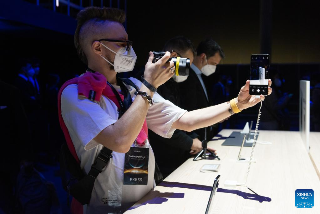 A man looks at a Honor's cellphone during the Mobile World Congress (MWC) in Barcelona, Spain, on Feb. 28, 2022. Around 50 Chinese companies, including Huawei, ZTE and Xiaomi, are present at the annual Mobile World Congress (MWC), which opened its doors here on Monday. (Photo by Gustavo Valiente/Xinhua)