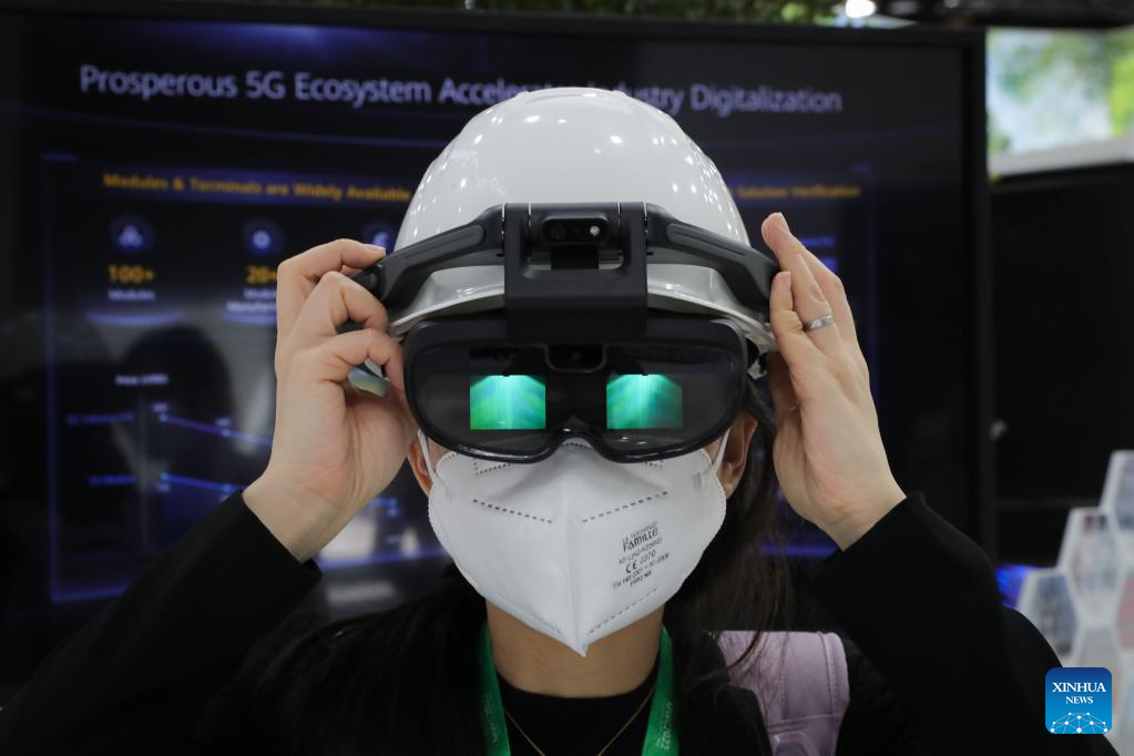 A visitor tries a 5G industrial helmet at the exhibition area of Huawei during the Mobile World Congress (MWC) in Barcelona, Spain, on March 1, 2022. Around 50 Chinese companies, including Huawei, ZTE and Xiaomi, are present at the annual Mobile World Congress (MWC), which opened its doors here on Monday. (Xinhua/Zheng Huansong)