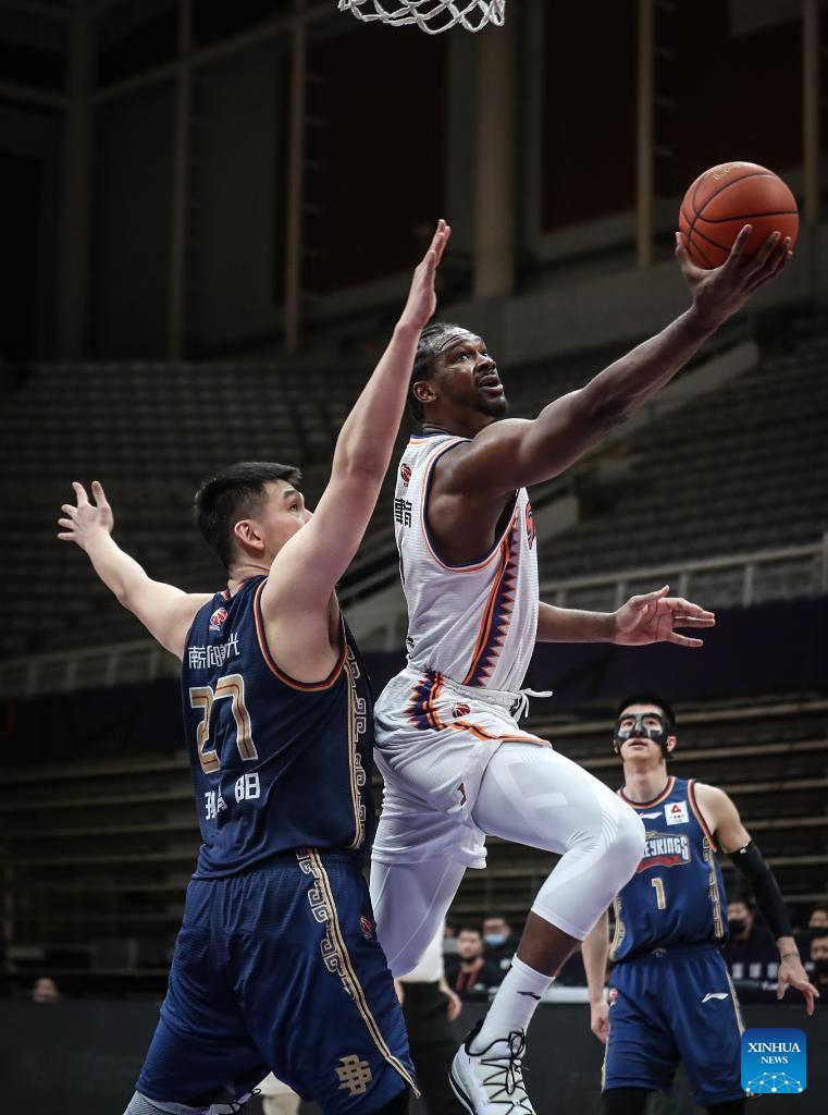 Noah Vonleh (R) of Shanghai Sharks goes to basket during the 29th round match between Shanghai Sharks and Nanjing Monkey Kings at the 2021-2022 season of the Chinese Basketball Association (CBA) league in Shenyang, capital of northeast China's Liaoning Province, on March 1, 2022. (Xinhua/Pan Yulong)