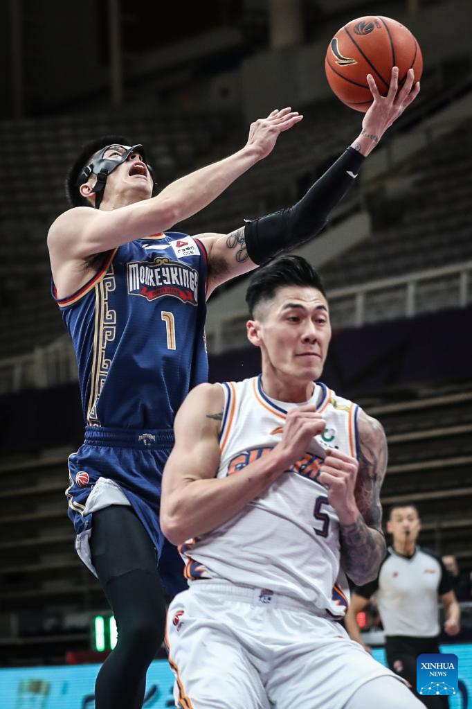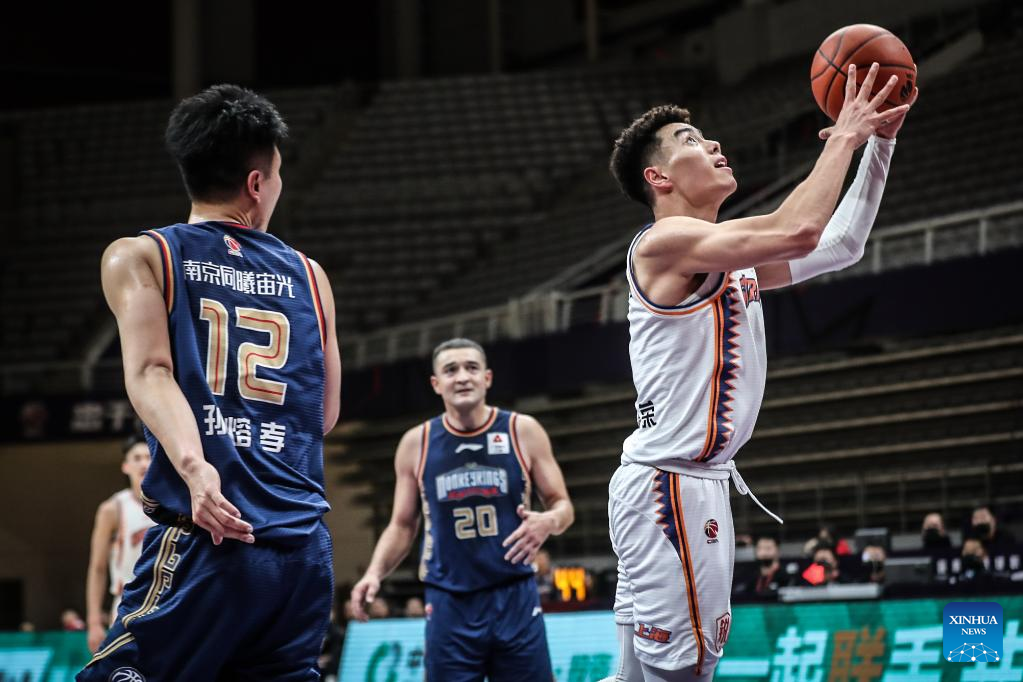 Wang Zirui of Nanjing Monkey Kings goes to basket during the 29th round match between Shanghai Sharks and Nanjing Monkey Kings at the 2021-2022 season of the Chinese Basketball Association (CBA) league in Shenyang, capital of northeast China's Liaoning Province, on March 1, 2022. (Xinhua/Pan Yulong)